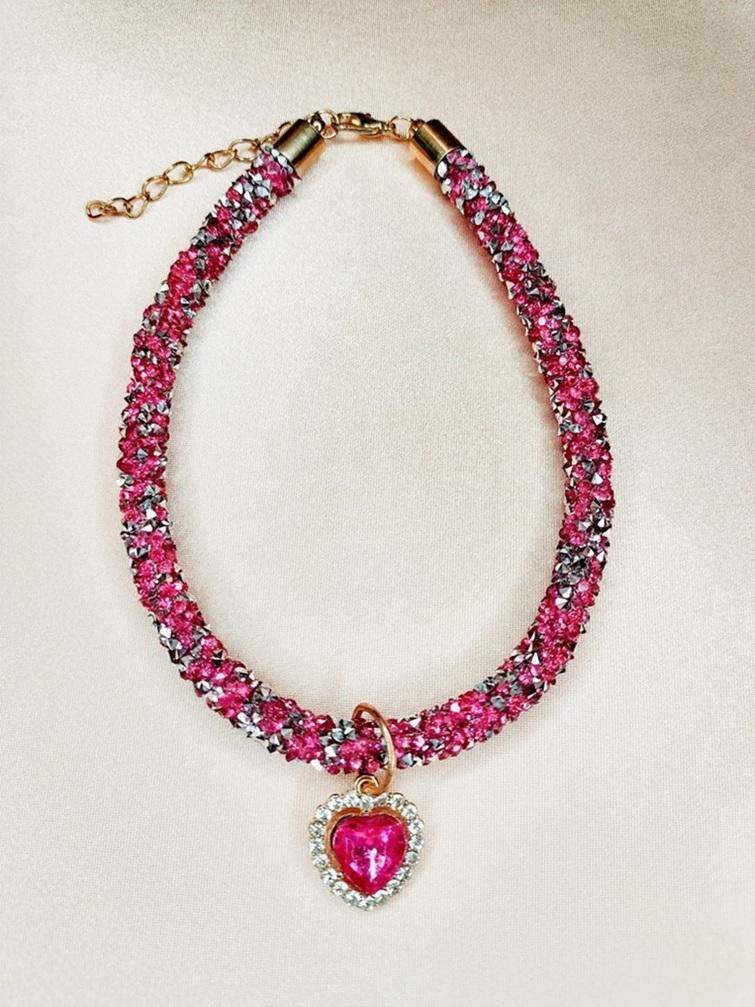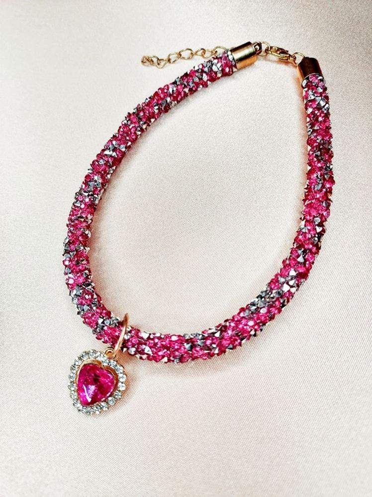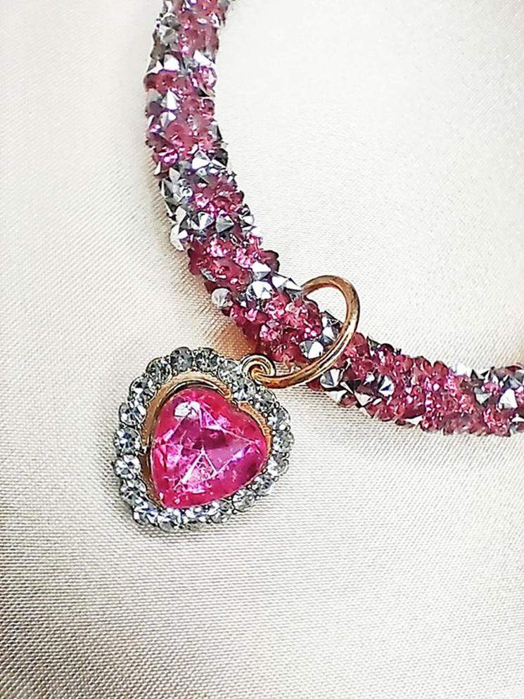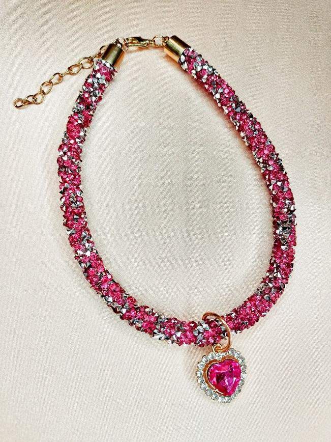 Brokatowa obroża różowo-srebrne kamyczki z serduszkiem Nasza kolejna propozycja w kolorach różu - pięknie mieniący się w świetle naszyjnik w kolorze różowo-srebrnym, wysadzany drobnymi kamyczkami, wykończony regulowanym zapięciem w kolorze złotym. Dodatkiem jest zawieszka w kształcie serca, która będzie wspaniałym symbolem Waszej pięknej relacji. Błyszczący, duży kamień w kolorze intensywnie różowym, otoczony białymi cyrkoniami dodaje blasku Twojemu pupilowi. Kolory dominujące: - różowy - srebrny - złoty Wymiary naszyjnika: - minimalna długość 26,5 cm - maksymalna długość 32 cm - szerokość naszyjnika 7 mm Wymiary zawieszki: - wysokość 2 cm - szerokość 1,5 cm