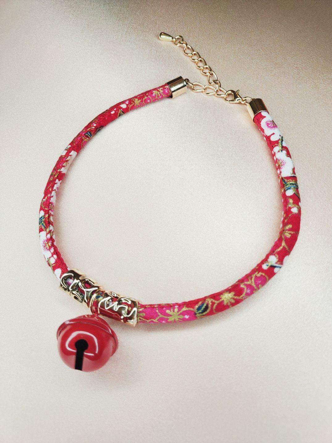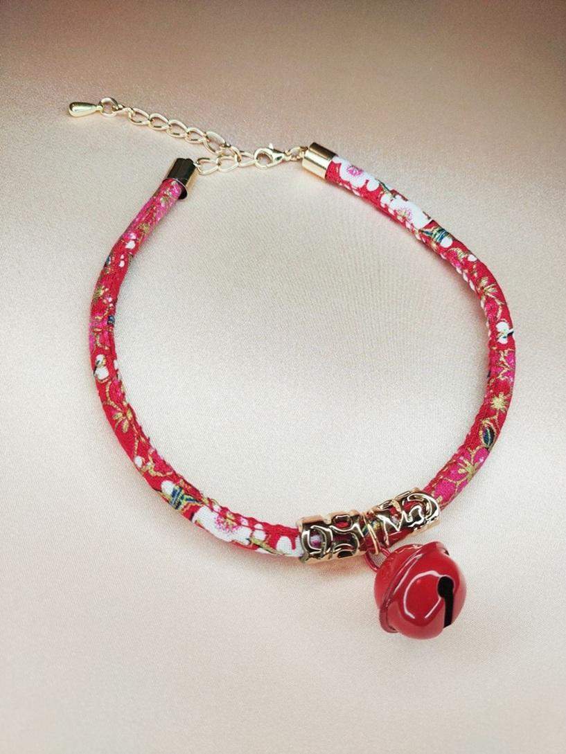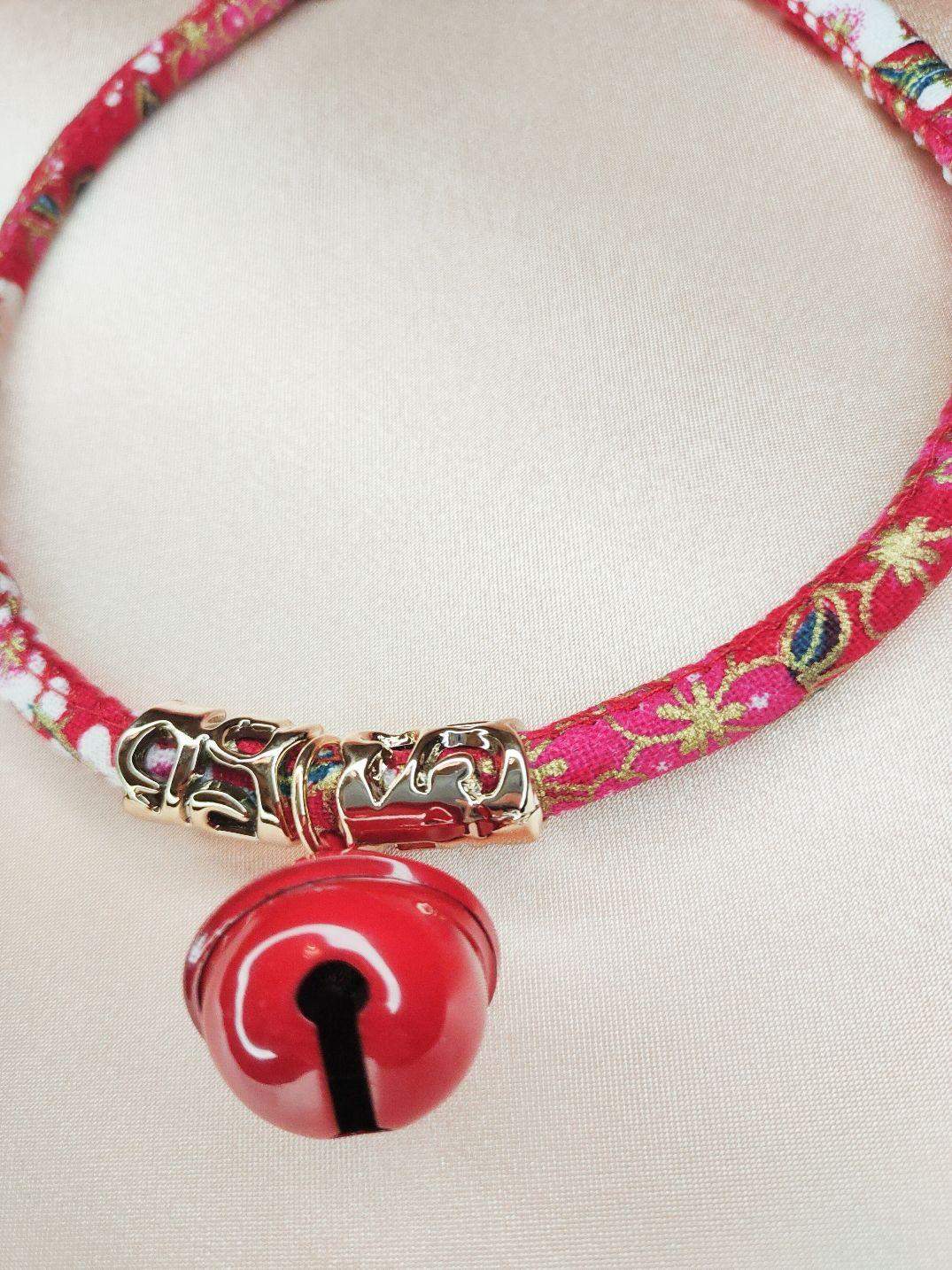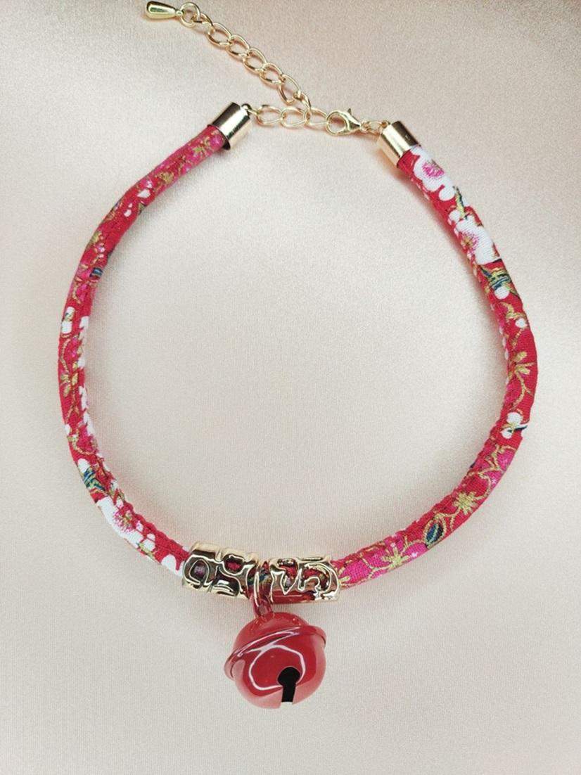 Czerwona obroża w kwiaty z dzwoneczkiem dla dużego kota Urocza czerwona obroża z dużym dzwoneczkiem stworzona z myślą o większych kotach. Wyrazisty wzór kwiatowy oraz złote elementy nadają elegancji, zaś duży czerwony dzwoneczek pięknie wyróżnia się na szyi pupila. Kolory dominujące: - czerwony - złoty Wymiary naszyjnika: - minimalna długość 33,2 cm - maksymalna długość 39,1 cm - szerokość naszyjnika 7 mm Wymiary zawieszki: - wysokość 1,7 cm - szerokość 2,1 cm