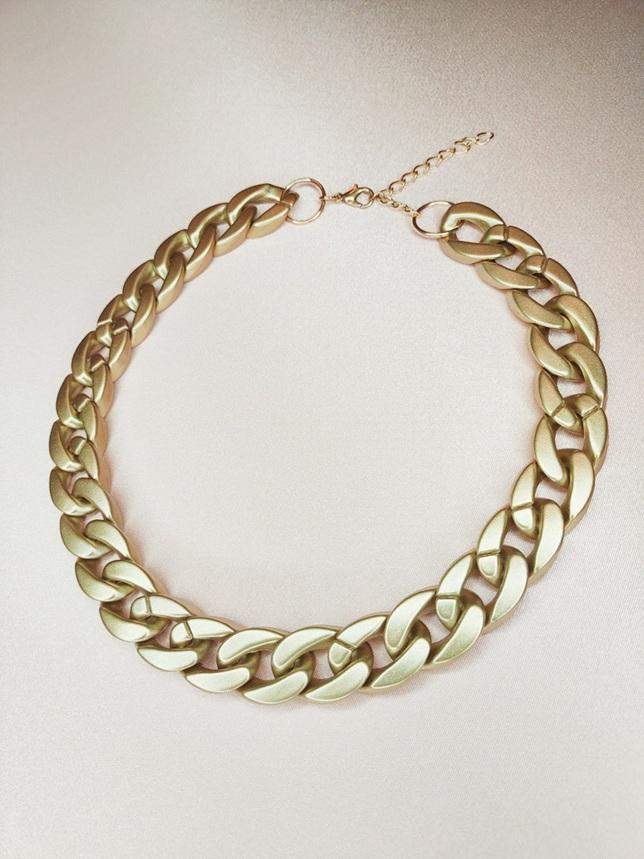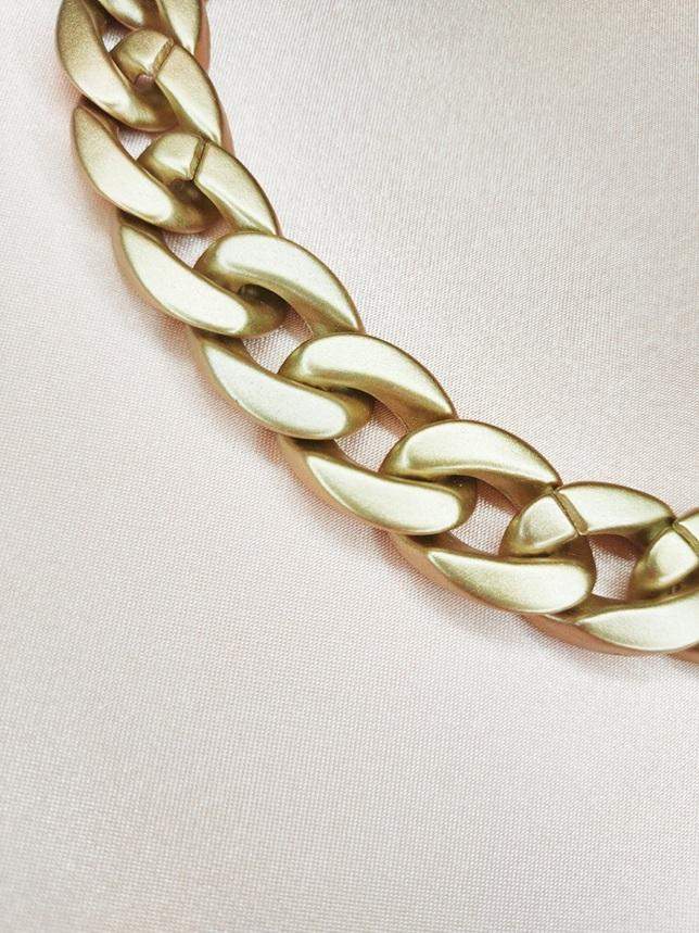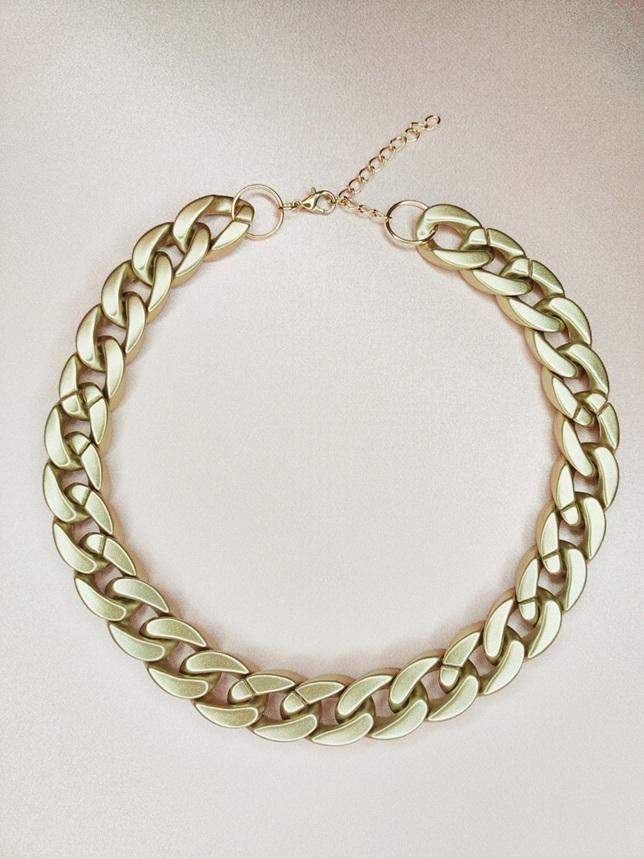 Złota matowa obroża dla psa (większa) Lekki łańcuszek w kolorze matowego złota, który będzie eleganckim dodatkiem na szyi Twojego psa. Dbamy nie tylko o wizualny efekt, ale także o zdrowie szyi Waszych pupili. Dlatego ten produkt wykonany jest z lekkiego akrylu i stanowi doskonałą alternatywę dla ciężkich metalowych obroży. Kolory dominujące: - złoty Wymiary naszyjnika: - minimalna długość 39,4 cm - maksymalna długość 44,8 cm - szerokość 15 mm Materiał: - łańcuszek akrylowy - zapięcie metalowe