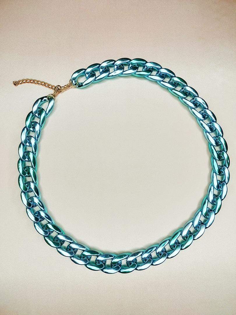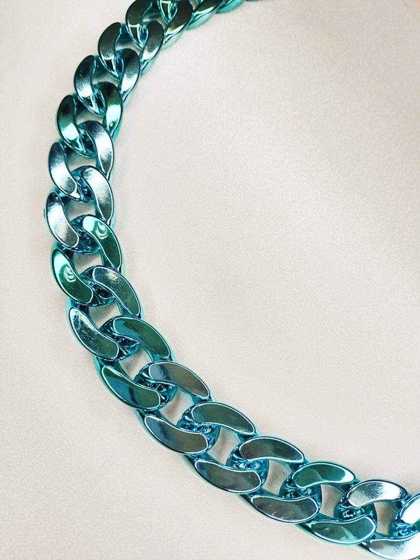 Błyszczący niebieski łańcuch XXL dla dużego psa Odważne kolory nie są tylko dla odważnych psów. Zatem każdemu futrzakowi proponujemy błyszczącą obrożę w kolorze błękitu przechodzącego w seledynowy. Naszyjnik zakończony jest regulowanym zapięciem w kolorze złotym, aby lepiej dopasować się do obwodu szyi - nawet 70 cm. Nie obawiaj się o wagę łańcuszka - wykonany jest z lekkiego akrylu, aby nie obciążać szyi Twojego pupila. Kolory dominujące: -błękitny - seledynowy - złoty Wymiary naszyjnika: - minimalna długość 64,5 cm - maksymalna długość 71,2 cm - szerokość 19 mm Materiał: - łańcuszek akrylowy - zapięcie metalowe