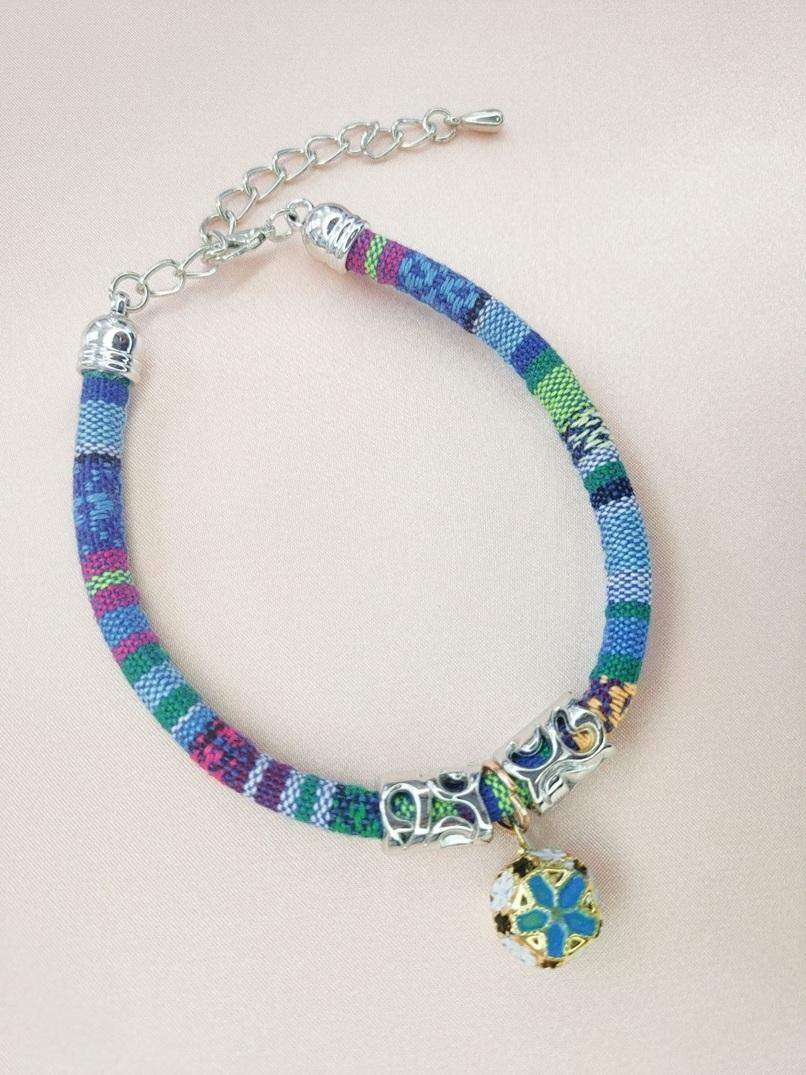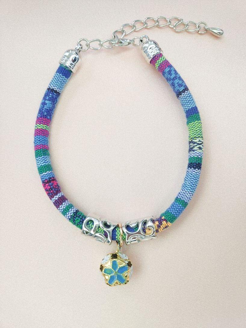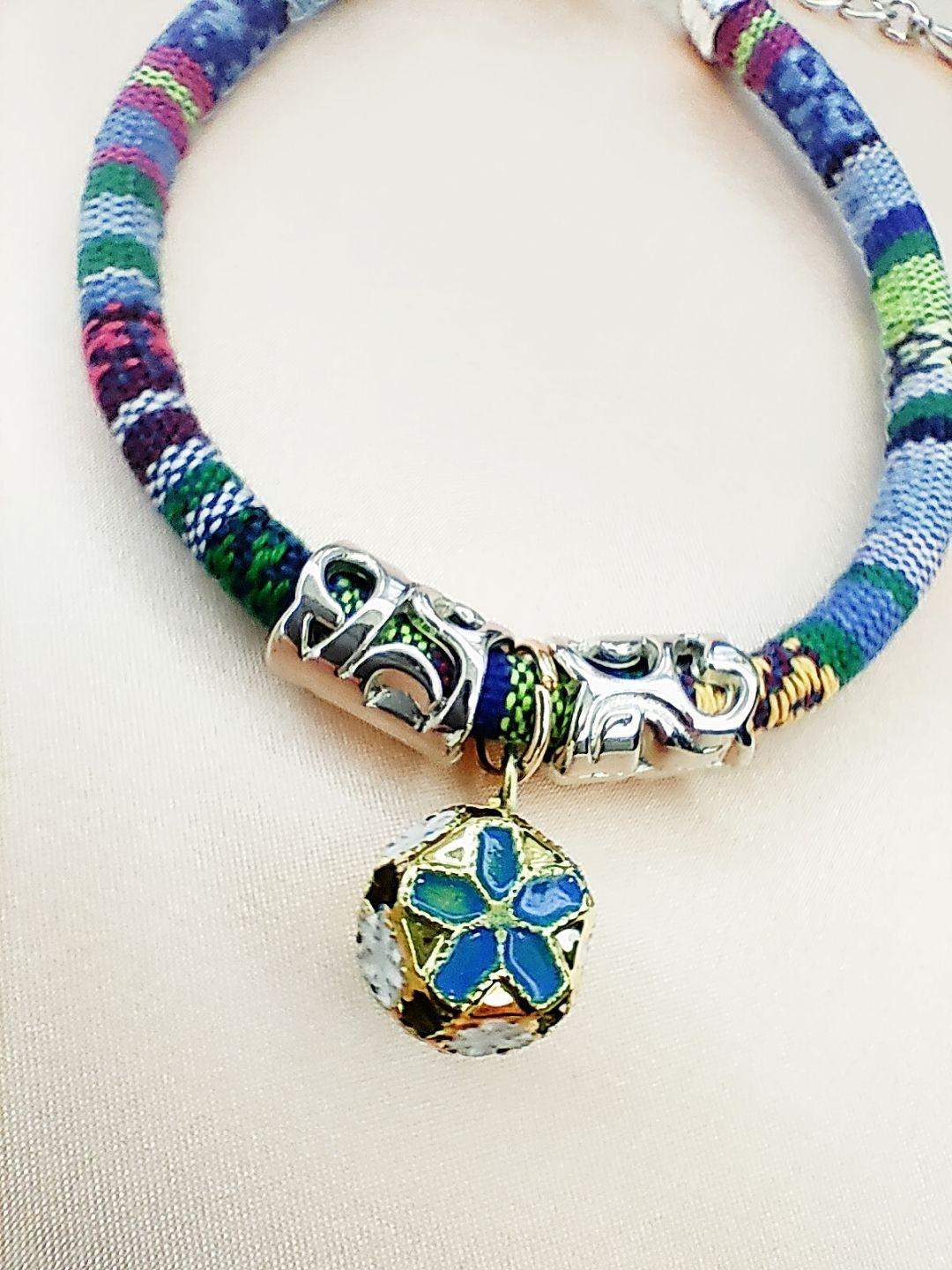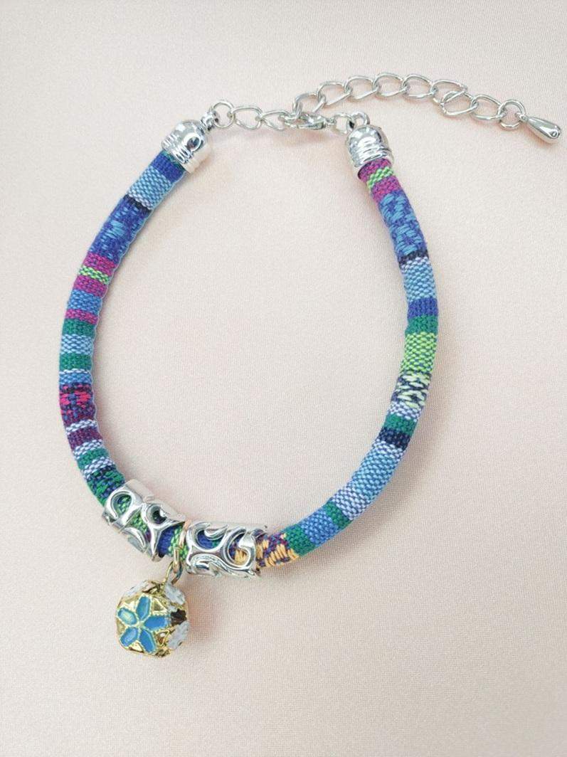 Obroża dla kota bawełniana z niebieskimi paskami i dzwoneczkiem. Subtelna obroża dla kota w odcieniu niebieskim z kolorowymi paseczkami oraz biżuteryjne elementy, w tym połyskujący dzwoneczek dodają blasku na szyi Twojego pupila. Wisienką na torcie jest symbol kwiatka, który zdecydowanie przyciąga wzrok. Czy widzisz już jak Twój kot dumnie nosi taką obrożę? Bo my zdecydowanie tak! Kolory dominujące: - niebieski - srebrny - wielokolorowy Wymiary obroży: - minimalna długość 24,2 cm - maksymalna długość 30,7 cm - szerokość 6 mm Wymiary zawieszki: - wysokość 19 mm - szerokość 15 mm
