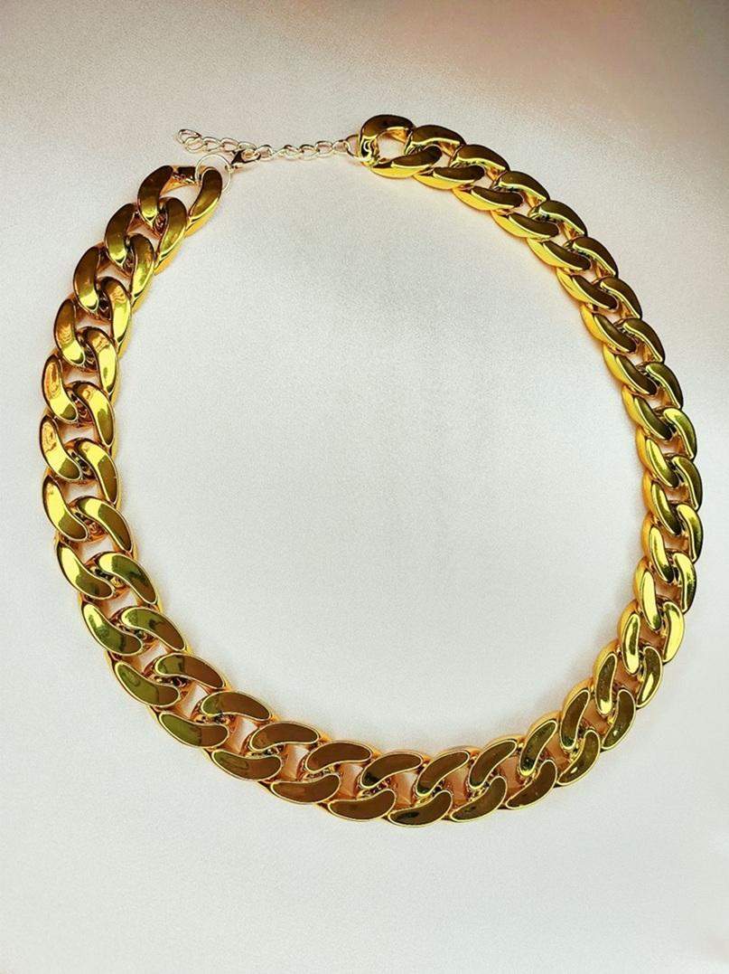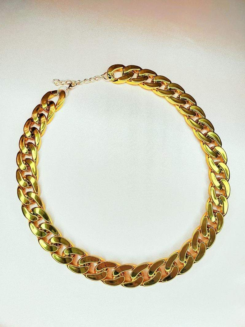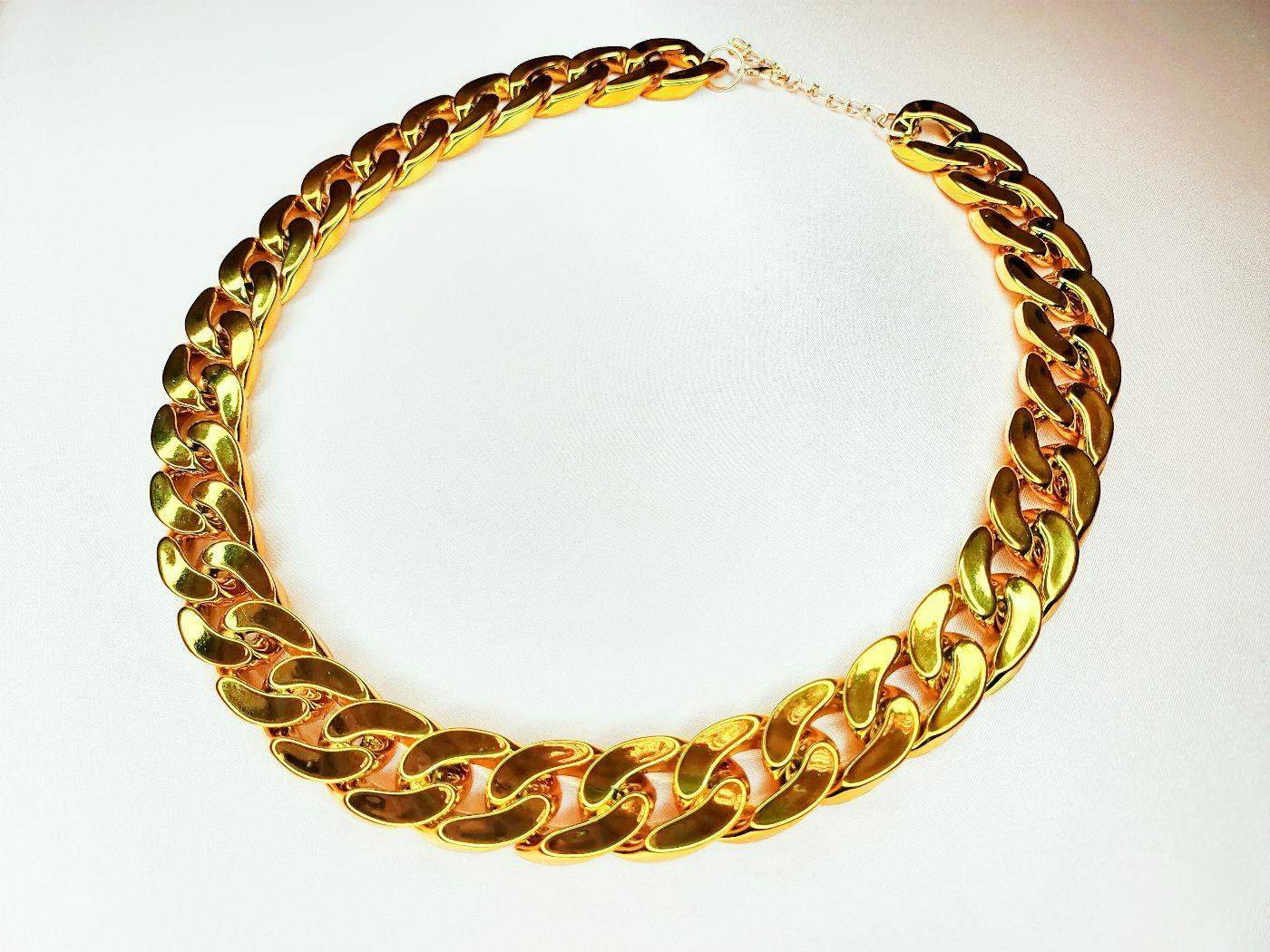 Błyszczący, szeroki i lekki łańcuszek w kolorze złotym dla bardzo dużego psiaka. Obroża z regulowaną długością zapięcia dla bardzo dużych psów, aż do 64,8 cm obwodu szyi.