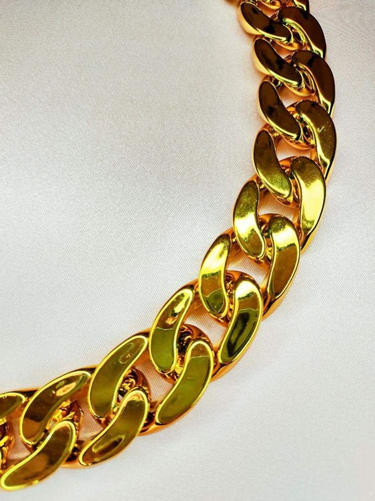XXL Błyszcząca złota obroża dla dużego psa Błyszczący, szeroki i lekki łańcuszek w kolorze złotym dla bardzo dużego psiaka. Obroża z regulowaną długością zapięcia dla bardzo dużych psów, aż do 64,8 cm obwodu szyi. Tak niepowtarzalny łańcuszek z pewnością przykuje uwagę niejednego przechodnia. Dbamy nie tylko o wizualny efekt, ale także o zdrowie szyi futrzaków. Dlatego ten produkt wykonany jest z lekkiego akrylu i stanowi doskonałą alternatywę dla ciężkich metalowych obroży. Kolory dominujące: - ciemny złoty Wymiary naszyjnika: - minimalna długość 58,8 cm - maksymalna długość 64,8 cm - szerokość 20 mm Materiał: - łańcuszek akrylowy - zapięcie metalowe
